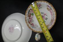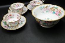 This is for a lovely set of three tea cups with saucers and large sugar bowl/small fruit bowl which measures just over 7" in diameter. These are antique items from around 1850 and were hand painted. There are no cracks or chips and the bowl rings nicely when flicked. Maybe the bowl is a little large for sugar so check size. This is a really gorgeous set.